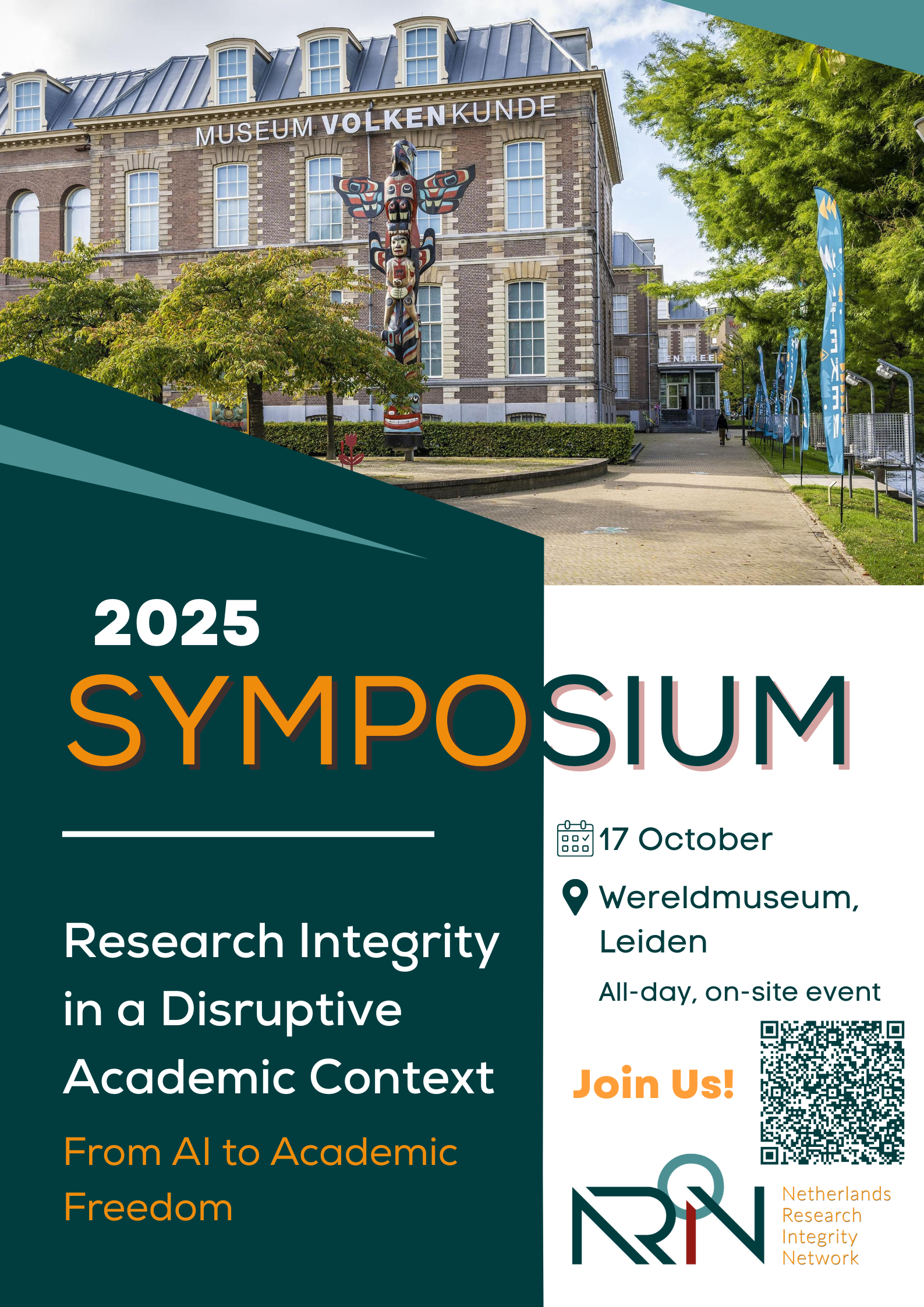 We are excited to announce that the NRIN Annual Symposium 2025, with the central theme ‘Research Integrity in a Disruptive Academic Context: from AI to Academic Freedom’, will be held on 17th October 2025 at Wereldmuseum Leiden (see location here: link).